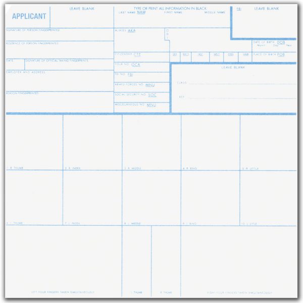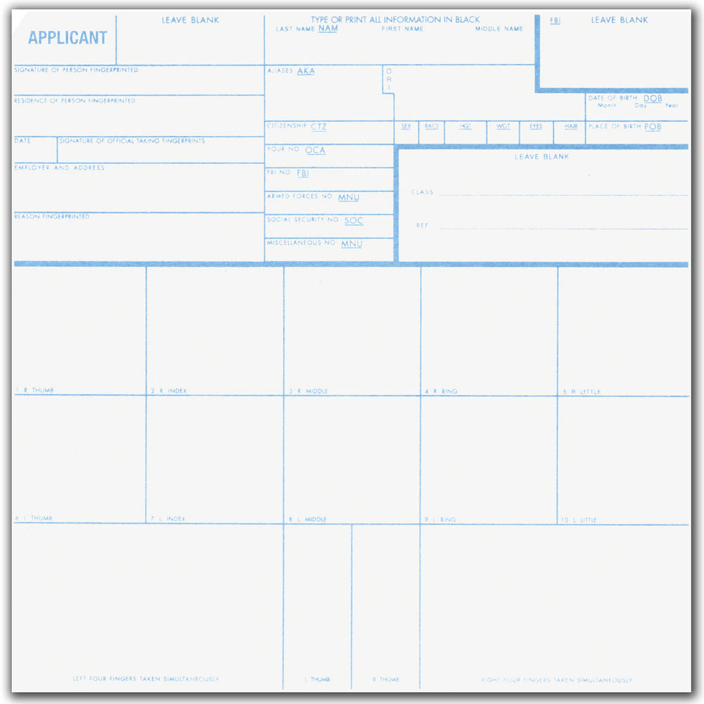 These standard FD-258 8″ x 8″ Applicant Fingerprint Cards are available for applicant and non-criminal fingerprinting. Printed with non-fading blue ink on white card stock. Conforms to FBI requirements.