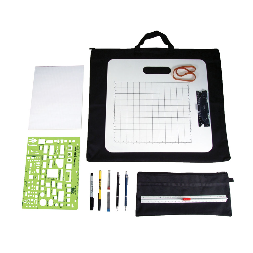 An accurate crime scene sketch provides a valuable tool during reconstruction and analysis. This basic kit allows for sketches of indoor and outdoor scenes. Includes a sturdy clipboard with quadrille graph paper.