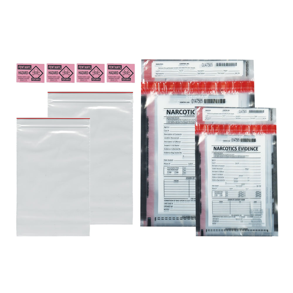 This basic evidence packaging kit is intended for a single-use collection of potentially hazardous powdered narcotics that may contain Fentanyl or other hazardous drugs. The included resealable 4 mil plastic bags are placed inside of the evidence security bags to create the recommended double layer of packaging. Components are packaged and delivered in a plastic bag.