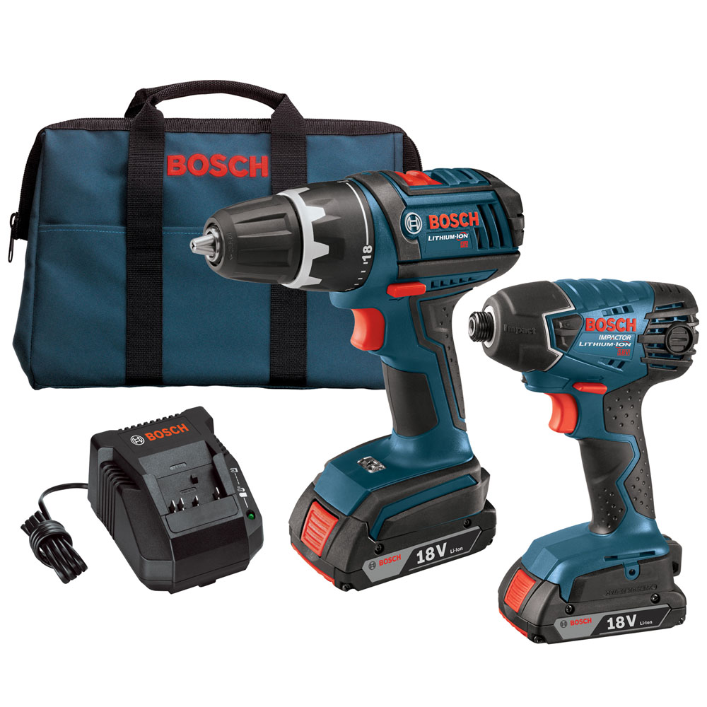 These combo sets each include a rechargeable drill and a rechargeable driver. The drills may be used with standard drill bits. The drivers may be used to install or remove screws and other fasteners. Each combo set includes a zippered case, two batteries, and a battery charger. Use with caution and always wear gloves and eye protection. Available in 12 Volt or 18 Volt models.
