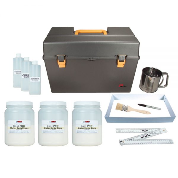 The Cast-PRO Shaker Dental Stone Deluxe Kit contains the necessary tools for casting in a variety of conditions, including a sifter for depositing dry casting material into underwater impressions. Depending on needs, customize the kit by adding Dust & Dirt Hardener or Snow Print Wax. Does not include water, fill containers before use. Available with either Buff or Blue dental stone. Additional Shaker Dental Stone refills available.