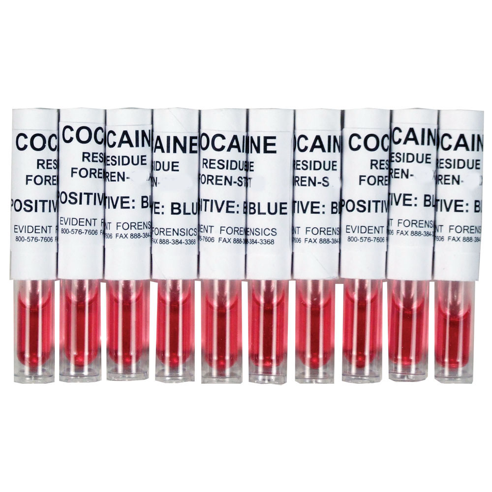 These swab style tests may be pressed against a suspected surface or sample to collect a small sample prior to breaking the internal glass vial. A resulting blue color indicates the presence of cocaine.