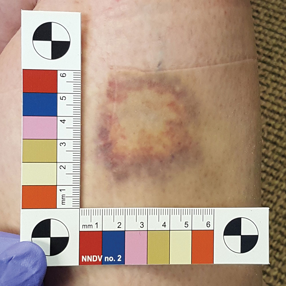 Medical examiners and forensic odontologists are frequently asked to establish the age of a bruise or bitemark on either living or deceased subjects. The age of bruising has an important medico-legal significance and may be relevant in the investigations related to such crimes as child abuse, domestic violence and homicide. Emilio Nuzzolese (DDS, MSc, PhD, Forensic Odontologist), Prof. Margherita Neri (MD, PhD, Medical Examiner), and Prof. Giancarlo Di Vella (MD, PhD, Medical Examiner) designed a scale which can  be employed on living subjects during different stages of the healing process, or on cadavers in order to provide evidential documentation, image verification and analysis. The Colorimetric Scale NNDV no. 2 does not attempt to give a definitive account of the diverse scientific methods available for the assessment of the age of bruising.  Dimensional accuracy verified with a NIST traceable standard.  Available exclusively from EVIDENT.