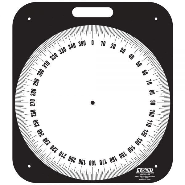 Designed to be securely fastened at a central location at the scene, corresponding distances and angles are then taken from the center of the Compass Rose. The Compass Rose is a flat square piece of durable plastic, measuring 15½” x 17½”, with white degree markings around the center of the black board. Integral handle makes use and transport more efficient.