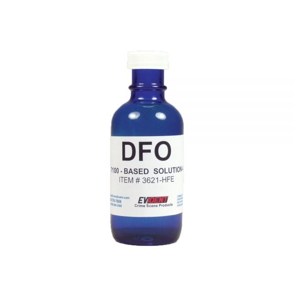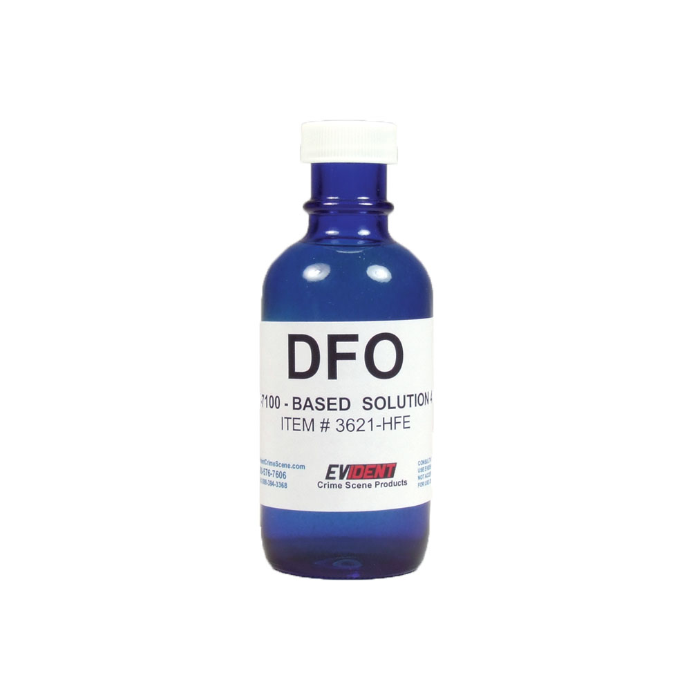 D.F.O. (1,8-Diazafluoren-9-one) is used to develop latent prints on porous surfaces. D.F.O. reacts to the amino acids present in a latent fingerprint. The resulting prints will fluoresce with the use of a forensic light source. D.F.O. may be applied by either dipping or spraying. After processing with D.F.O., the development may be accelerated with heating. The item must be dried, then placed in a heating chamber set to approximately 212°F for 20 minutes, or heated with a standard dry clothing iron (no steam). EVIDENT provides D.F.O. Premix Solutions as a 4 oz. premix liquid. Available in HFE-7100 mixture.