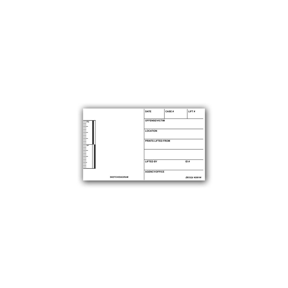A final step in preserving a lifted latent fingerprint is placement on a quality backing card. EVIDENT Backing Cards provide a gloss coated front for your latent lifts with a documentation form on the non-gloss reverse side. A 2″ photo scale is imprinted on each card and may be used for photography prior to lifting the impression with tape. 8½” x 11″ cards are ideal for recovering palm or shoe impressions. Each size is excellent for latent prints, palm prints, or footwear impressions. Available in gloss White or gloss Black. Available in multiple sizes. Provided as packages of 100 imprinted backing cards.