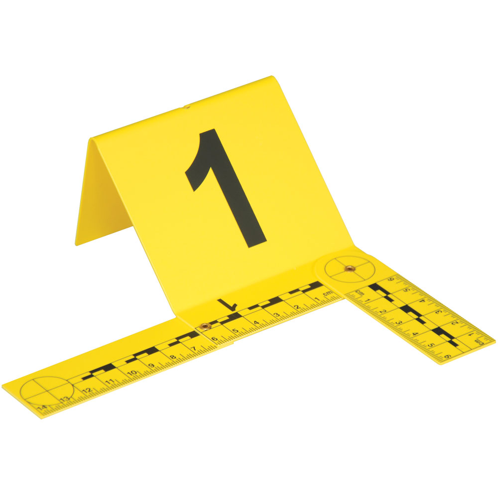 Our Folding Photo Evidence Markers feature an attached photo scale which may be extended into multiple configurations. Each 3½” x 3” marker is constructed of durable nonreflective yellow plastic with numbers and measurements imprinted in black. Each marker includes two hinged attachments which may be configured into multiple shapes. This is the ultimate photo evidence marker. Multiple numbered sets are provided. Optional zippered cases are available with capacities of 20 or 50.