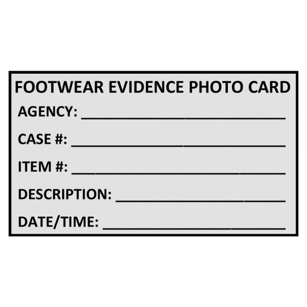 These small Footwear Evidence Photo Cards feature a gray background and spacing for included case information. A completed card should be included in each footwear impression image. Each card measures 3½” x 2”. Provided as packs of 25 cards.