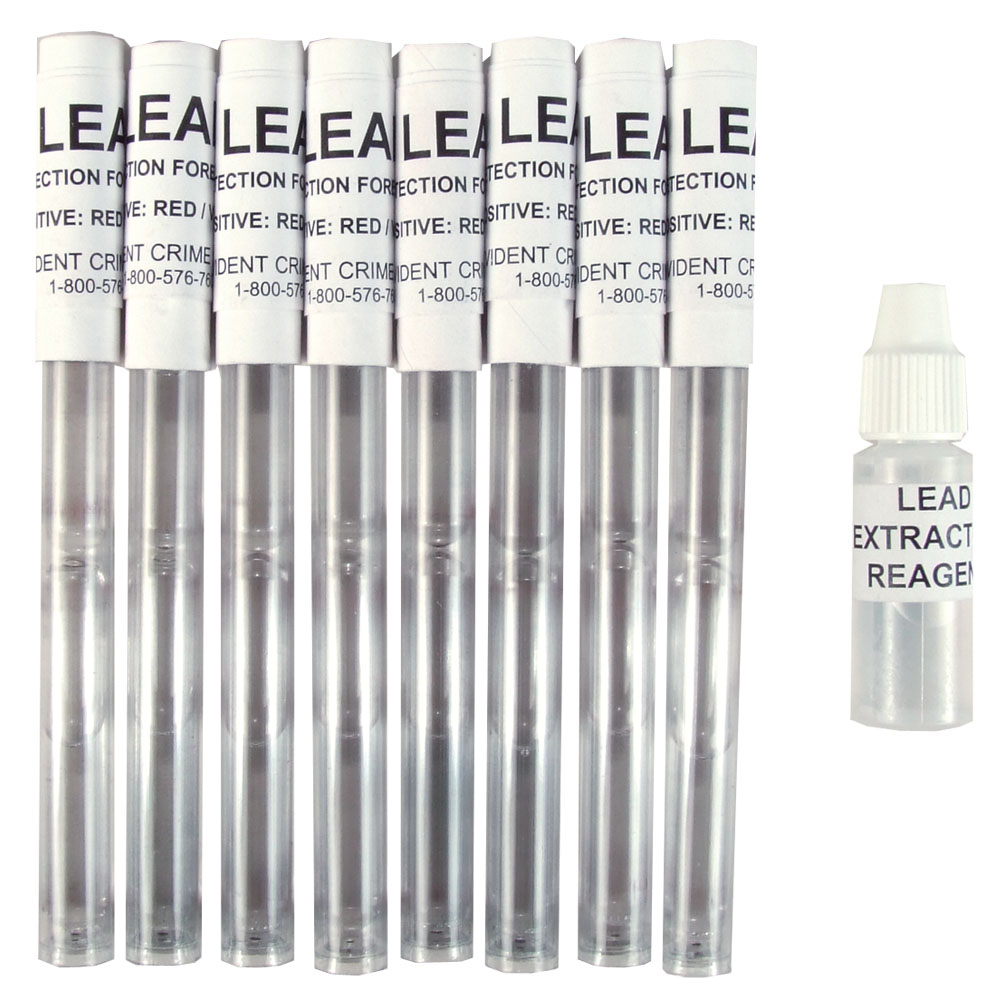 Foren-Tests Lead Test Swabs and Copper Test Swabs are designed to provide the crime scene investigator with the ability to conduct a presumptive chemical field test for the presence of lead. Simply remove the protective cap, moisten the attached swab pad with the included distilled water, rub the swab on the suspected lead mark to transfer a sample of the mark to the pad, break the crush vials in the plastic tube, and observe a color change to indicate a positive presumptive reaction to the presence of lead or copper. Provided as a package of eight swabs.