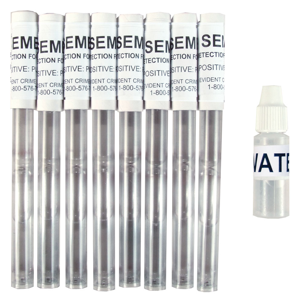 Foren-Tests Semen Test Swabs are designed to provide the crime scene investigator with the ability to conduct a presumptive chemical field test for the presence of semen. Simply remove the protective cap, moisten the swab pad with the included water, rub the swab on the suspected biological stain to transfer a sample of the stain to the pad, break the crush vials in the plastic tube, and observe a color change in the swab pad to indicate a positive presumptive reaction to the presence of semen. Provided as a package of eight swabs.