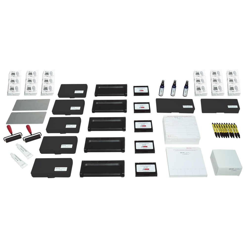 This kit includes the required training components for recording inked fingerprints by a group of students. All items are packaged in a cardboard box.