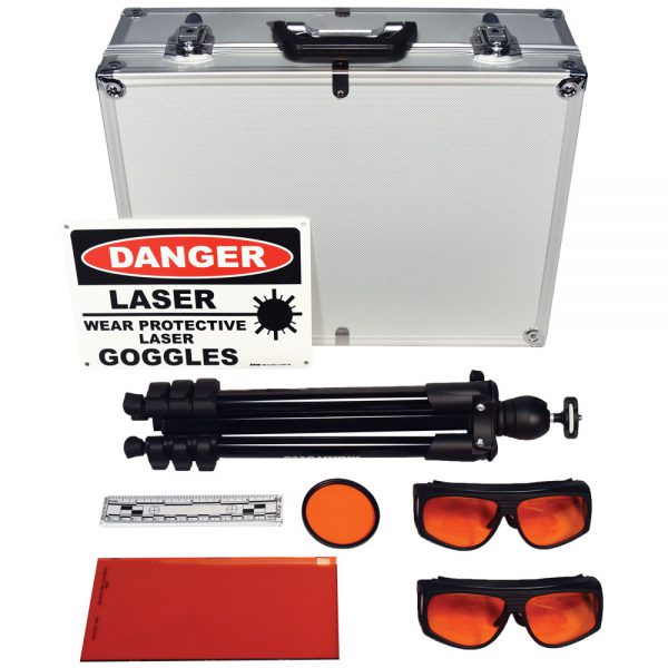The kit includes multiple accessories for use with an existing FoxFury PL Blue Laser.  The included 72mm Orange Laser Camera Filter may be attached to a camera using the various step-up rings that are provided.  The laser may be mounted to the included tripod for hands-free operation.  All items packaged in a metal carrying case.  Laser not included with this kit.