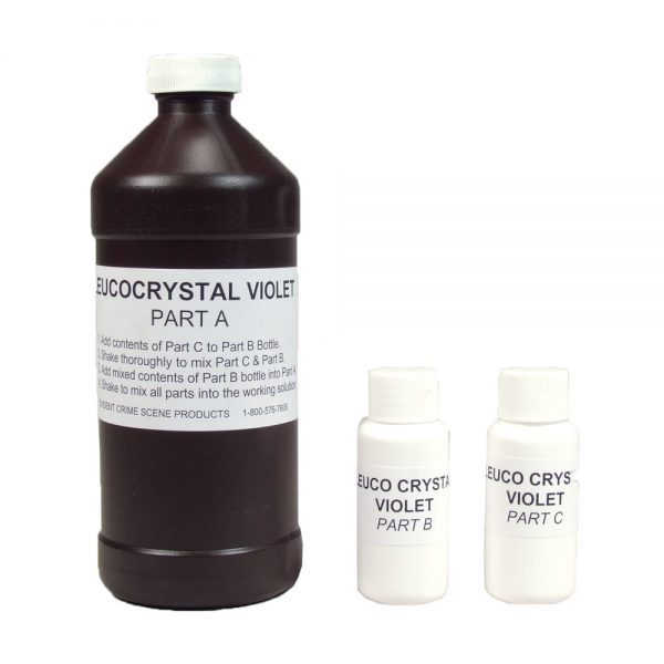 An effective protein stain used to develop and enhance fingerprints or footwear impressions which have been deposited in blood. L.C.V. does not produce background staining, and does not require destain rinse. Excellent for use on flooring such as light-colored carpet or tile. Apply with a fine spray mist. Contains blood fixative. Provided as a 16 oz. premix set.