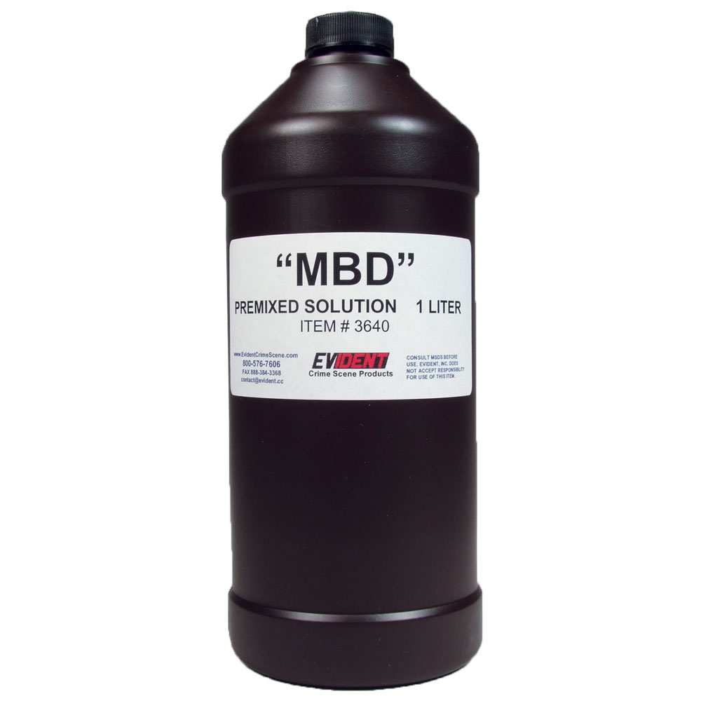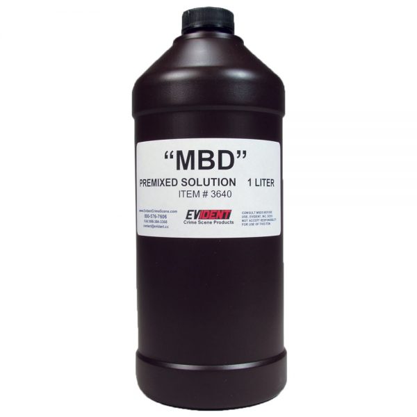 M.B.D. Dye Stain is used after cyanoacrylate processing on multi-color surfaces. M.B.D. is fluorescent when exposed to a forensic light source between 415nm and 535nm, making it ideal for use with a wide variety of forensic light sources. Provided as a 32 oz. premix bottle.