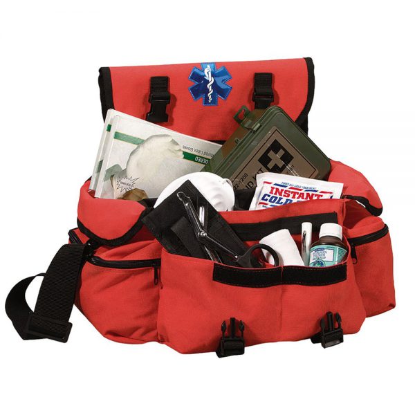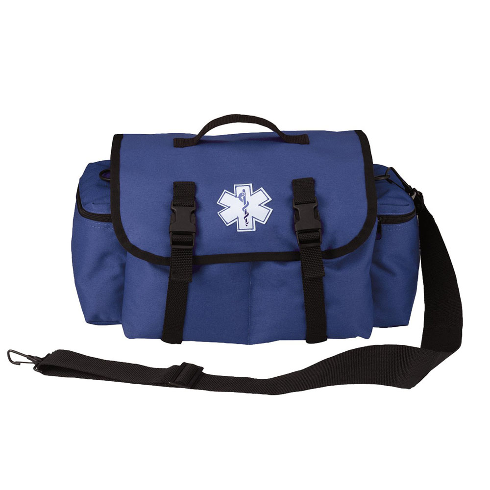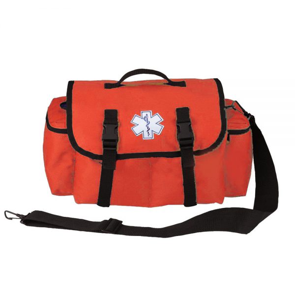 This heavy duty Medical Response Bag features three main compartments, and two large side pockets. Constructed of water resistant blue or orange fabric with carry handle, shoulder strap, and star of life emblem. Bag measures 9″ x 7″ x 15″. Contents not included.