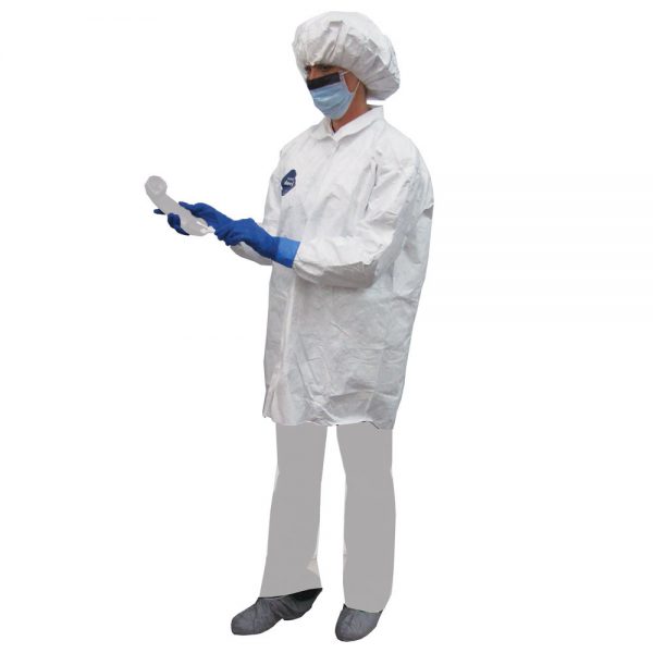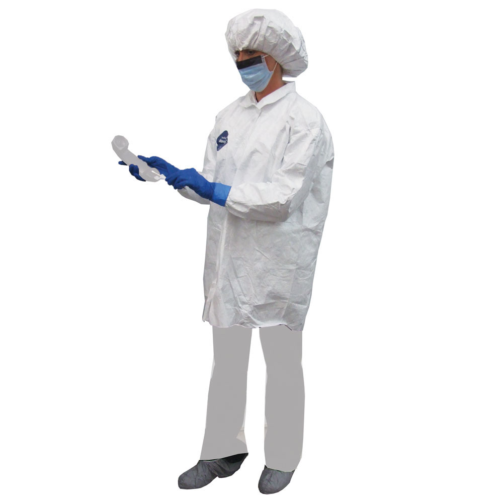 This protection kit is intended for evidence collection at the crime scene, lab, or office. Each kit includes Tyvek Lab Coat, Mask w/ Eye Shield, Hair Cover, Shoe Covers, two pair Extended Cuff Nitrile Gloves, two antimicrobial towelettes, and a biohazard trash bag, all packaged in a plastic bag.