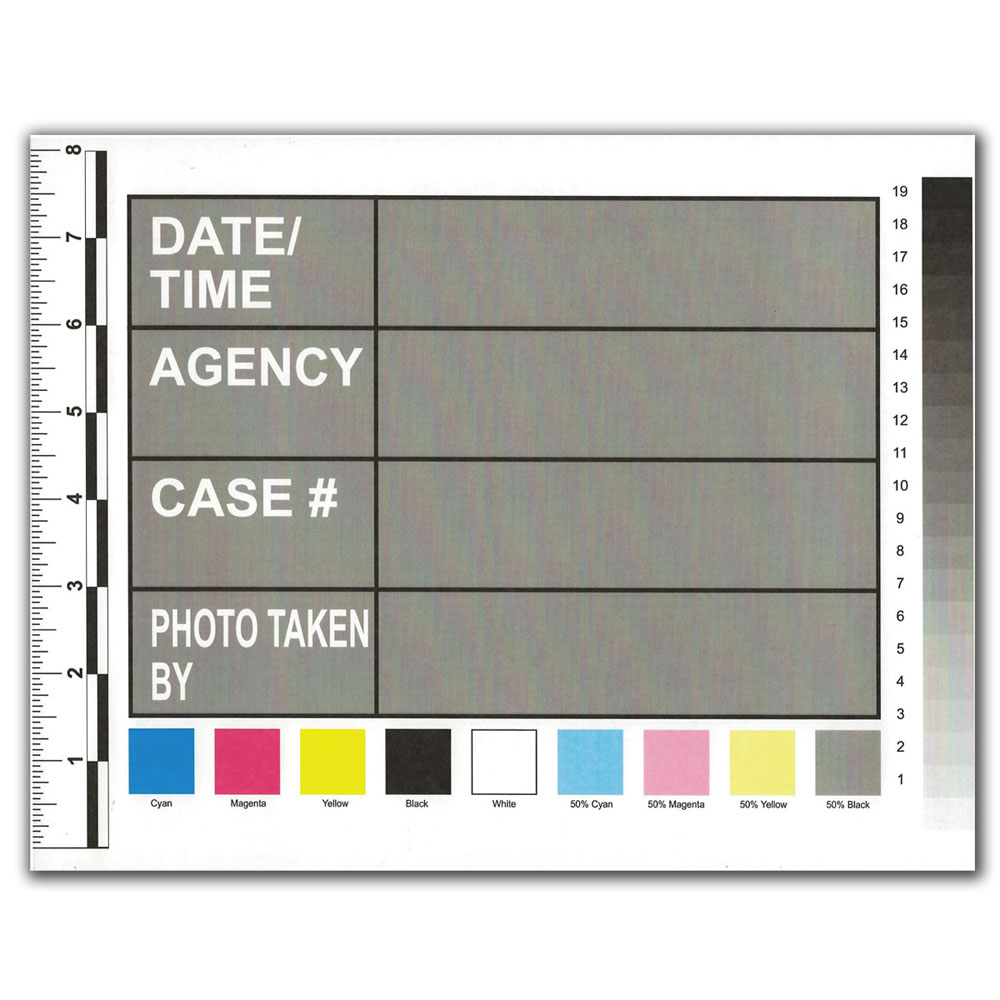 These Photographic ID Cards feature a color scale and gray scale for verifying camera settings. They also include spacing for included case information. A photo of a completed card should be taken at the start of each scene. Provided in two sizes as packs of 25 cards.