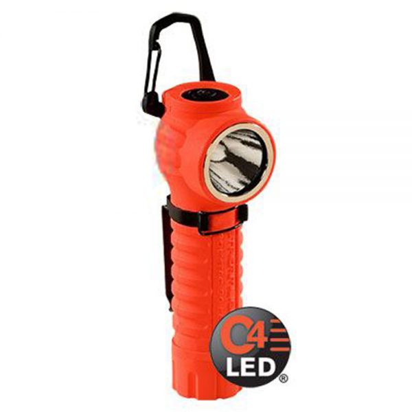 The PolyTac 90 features a right-angle light design for mounting to clothing or gear. The included metal clip and top-mounted switch allow for easy access and operation. Powered by two CR123 lithium batteries. Measures 5.25″ x 1.25″.