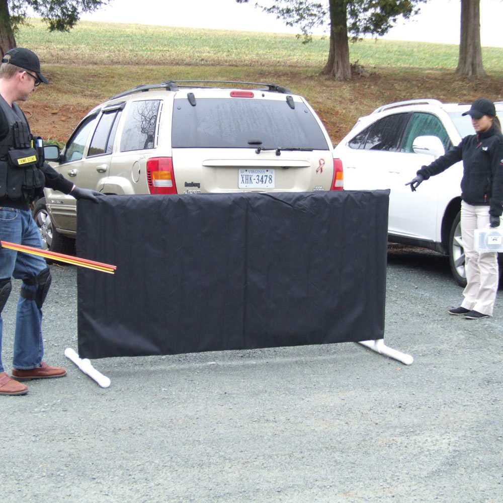 This Privacy Screen features a plastic frame and fabric cover which can provide a visual barrier for crime scene recovery. The frame is quickly assembled and completed with the fabric cover. Multiple screens may be attached together with the metal snaps to cover a larger area. Includes a storage bag.