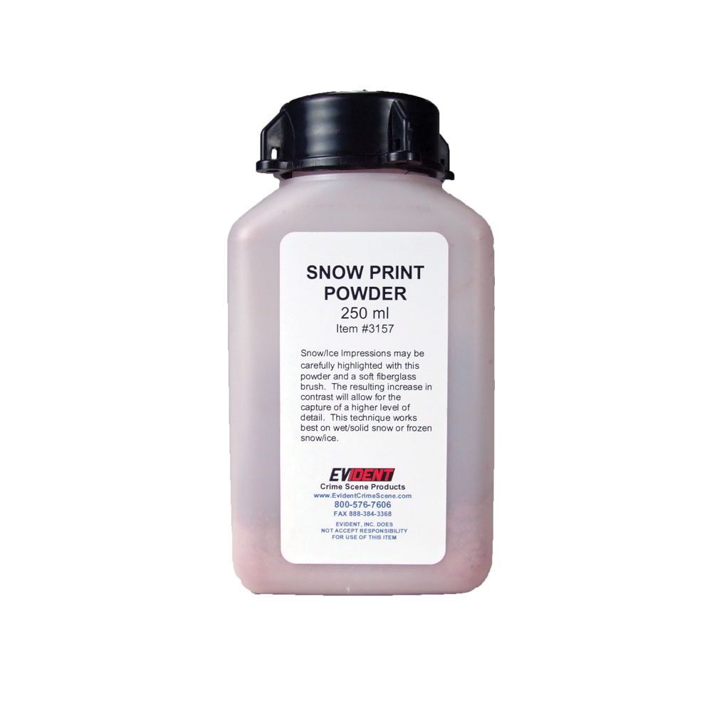 Snow Print Powder may be gently brushed directly onto icy or frozen snow print impressions using a fiberglass fingerprint brush. The contrast between the red powder and frozen snow will improve your photographic efforts. Do not use on fragile, soft, or fresh snow impressions.