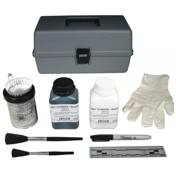 Wet Powder is a premixed liquid solution for use in the processing of adhesive sided evidence, such as duct tape, masking tape, packing tape, paper adhesive, aluminum tape, and fabric tape. Wet Powder has no shelf life, and requires only a very small amount of solution to receive excellent results. This kit is designed to provide everything needed for adhesive side processing with Wet Powder. Contents are neatly contained in a plastic field case with foam insert.